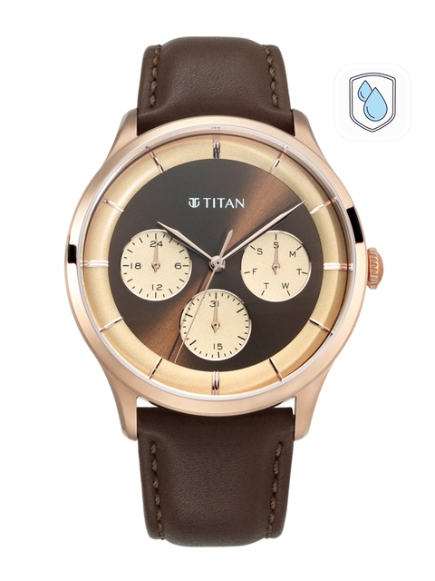 This impressive, trendy watch from Titan is sure to draw attention when you tell the time. This brown piece can be styled with slick black jeans and a classic leather jacket for an edgy date look.